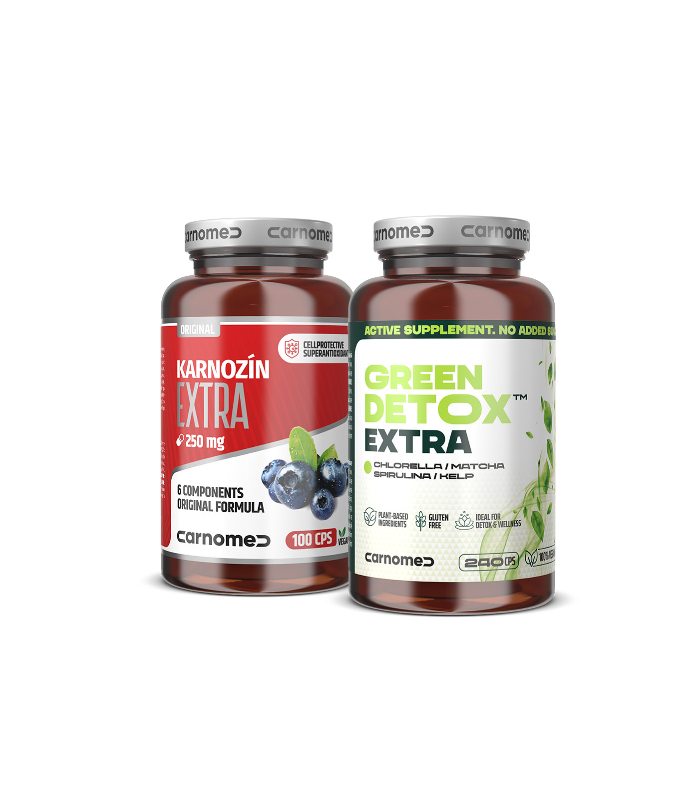 Kombinace účinných látek v Karnozinu EXTRA aktivně pomáhá chránit a posilovat buňky, dodává jim energii, zvyšuje jejich vitální funkce a zintenzivňuje výkon. Zároveň poskytuje nejvyšší antioxidační ochranu. V GREEN DETOX EXTRA spojení spiruliny, chlorelly, matchy a kelpu (japonských mořských řas) přináší jedinečnou kombinaci organických zelených složek pro detoxikaci a regeneraci organismu. Podpořte přirozenou obranyschopnost a dlouhodobou vitalitu efektivním způsobem.